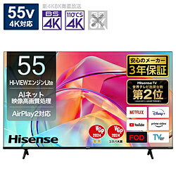 | ご利用ガイドよくある質問キャンセル・返品領収書の発行延長保証延長保証をご希望のお客様は、オプションからお買い求めください。設置について標準設置サービス込みの商品となります。商品のお届けと同時に開梱・設置・資材撤去を行います。設置内容や追加料金などご注文前に必ず「大型配送・設置サービスについて」をご確認ください。大型配送・設置サービスについてリサイクル回収テレビ・冷蔵庫(冷凍庫)・洗濯機(乾燥機)・エアコンのリサイクル回収を承ります。料金・お申込み方法をご確認ください。リサイクル回収についてハイセンスキャッシュバックキャンペーン商品紹介商品特長・スペック★ スクリーンシェア機能スマートフォンの画面をテレビに映し出せます。スマートフォンで撮影した写真や動画を皆で見て楽しめます。(Apple、Androidデバイス対応)★ HDMI2.1の端子が2個搭載HDMI2.1規格入力に対応。最新ゲーム機も快適にプレイできます。対応端子が2つあるのでケーブルを差し替えずに楽しんでいただけます。★ 低遅延ゲームモードボタンを押してから表示されるまでの遅延が少なく、特にFPSや格闘、アクションゲームなど判定にシビアなゲームに最適です。(ALLM設定、PCゲーム対応、HDMI2.1対応)★ AIネット映像高画質処理AIがネット配信の映像やVODコンテンツを分析し、最適な映像処理を行います。高いコントラストと自然な色彩で表情豊かに再現。★ 高音質機能Eilex PRISM、eilex FOCUS、VIRフィルター、ドルビオーディオを搭載することで、いつも聴きやすく音声を楽しめます。* 画面サイズ:55V型* 画面寸法:120.9×68.0cm* 画面寸法H:68* 画素数:3840×2160* パネル:ADS* HDR対応:HDR10/HLG/Dolby Vision* 視野角(上下/左右)(CR値20):178°/178°* 応答速度:8ms* 定格消費電力:141W* 待機電力(※リモコンでの電源OFF時):0.5W* 年間消費電力(※標準設定時)(2026年基準測定値)2022年前機種は2012年の値:115kWh* 省エネ基準達成率 (※2026年度) 2022年前機種は2012年の値:106%* エンジン:HI-VIEW エンジン Lite* バックライト:直下型* 輝度:350nit* パネルコントラスト比:1200:1* 解像処理:4K復元、AIネット映像高画質処理、HDR再現処理、エリア別クリア復元、クリアノイズ処理、テクスチャー復元、美肌リアリティー、フレームジャダー低減* 残像感低減:クリアモーション* ゲームモード:ゲームモード* HDMI2.1仕様:ALLM* スピーカー配置:2.0* スピーカー構成:フルレンジ×2* スピーカー最大出力:16W* 高音質機能:Eliex Prism、ダイレクトサウンド、自動音声モード、DOLBY AUDIO、VIRフィルター、Clear Sound、自動音量制御、サウンドリマスター* チューナー…・BS 4K/110度CS 4K:2・地上デジタル:2・BS・110度CSデジタル:2・CATVパススルー方式:●* 外付けHDD裏番組録画:●* 録画機能:●* 再生機能:早送り再生、コマ送り、スロー再生、0.5秒戻し、連続コマ戻し、1/20スキップ、追っかけ再生、続きから再生* システム:VIDAA* ネット動画サービス:Netflix/ Amazon Prime Video/ Disney+/ YouTube/ DAZN/ FIFA+/ ABEMA/ Hulu/ Lemino/ U-NEXT/ NHK+/ TVer/ Rakuten TV/ WOWOWオンデマンド/ FOD/ Net-VISION/ SPOOX* スマートホーム:works with alexaHomeKit* Anyview ホームサーバー/クライアント:●* スマホからスクリーンシェア:Anyview CastAirplay2* Bluetooth…・Bluetoothイヤホン/ヘッドホン/サウンドバー:●・Bluetooth対応リモコン:●* マルチメディア(動画・音楽・写真):●* 無線LAN内蔵:IEEE802.11ac/a/b/g/n* オン・オフタイマー:●* 環境光センサー:●* 音声操作:VIDAAボイス* HDMI:HDMI 2.1×2HDMI 2.0×1* eARC/ARC対応:eARC/ARC対応(HDMI入力2のみ)* USB:2(USB2.0×2)* USB電源供給対応:BC1.2対応×1* LAN:1* ビデオ入力:1* 光デジタル音声出力:1* ヘッドホン出力:1* 本体寸法(幅×高さ×奥行)…・スタンド含む(cm):123.2×76.9×27.4・スタンド含まない(cm):123.2×71.1×7.4* 本体質量…・スタンド含む(kg):11.5・スタンド含まない(kg):11.3* 付属品:取扱説明書、Bluetooth/赤外線リモコン(ERF3B46H)、単三形乾電池×2、電源コード、転倒防止ひも1式、スタンド1式 | |