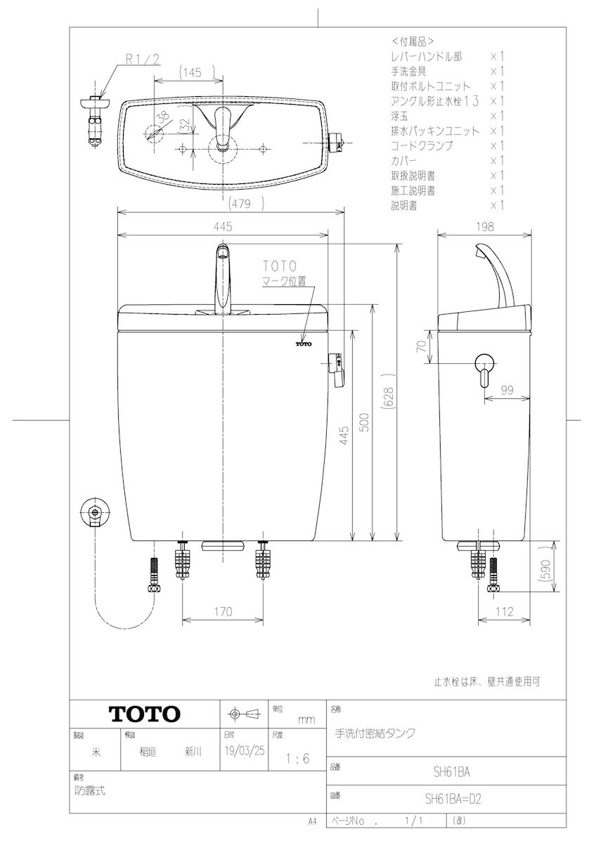 | メーカー TOTO(トートー 東陶) 商品名/仕様 ・組み合わせ便器 ※こちらの型番は、タンクのみになります。 ・手洗い:あり ・防露 ・凍結予防方式:一般地 ・洗浄水量:大6L・小5L ・実容量:7.8L[SH61BA] | |