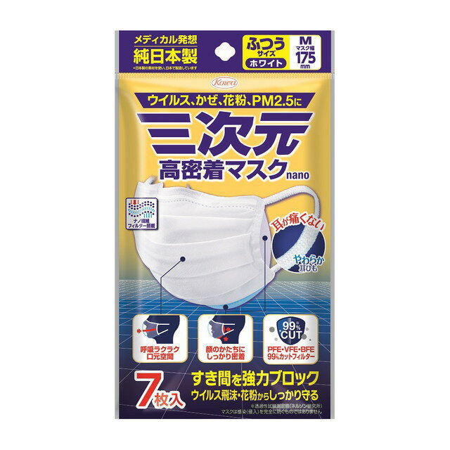 | 【即納】 三次元マスク ふつうMサイズ ホワイト 7枚 興和 KOWA コーワ 四層構造 痛くないふんわり耳ひも PM2.5対応 日本製 送料無料 日本製 三次元マスク 興和 商品説明:1.機能性を高めた新捕集フィルターを採用・高捕集フィルターが、1層で空気中の微粒子(0.0001mm=0.1μm)を99%*カット*透過性試験測定値(ネルソン研究所・天然カテキン由来の抗菌フィルター「カテプロテクトR」を内蔵フィルター表面の菌の増殖を抑制します(全ての菌に効くわけではありません)。・形状保持ノーズフィッター&サイドフィットフォルムが、鼻やほおのスキマを抑えます。2.ふんわりと快適なつけ心地・つけ心地UP!新規耳ひもを採用ふんわりタッチで、長時間つけても耳が痛くない**当社従来品比・肌ざわりやわらかな高品質不織布を使用口もとゆったり構造で、息苦しくなく、話し続けてもズレにくいので、長時間の使用も快適です。・メガネのくもりもブロックフォグブロックフィルムがマスク上部から生じる呼気漏れを、カバーで防ぐため、メガネがくもりにくい。再開封でき、衛生的に使用できるリクローズドピロー包装を採用・バージン性が高い・きれいに開け閉めできる・マスクの内側に触れずに取り出せる発売元:興和内容量:7枚入 2 | |