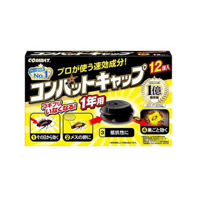 | お店TOP>日用品>虫よけ・殺虫剤・忌避>殺虫剤>殺虫剤 ゴキブリ用>KINCHO コンバットキャップ 1年用 (12個入*2箱セット)商品区分:医薬部外品【KINCHO コンバットキャップ 1年用の商品詳細】●8つの特長(1)置いたその日から効く!(2)メスのもつ卵に効く。卵を持ったチャバネゴキブリの卵にも効く!(3)しぶとい抵抗性ゴキブリにも効く(4)2度効く!巣ごと効く!巣に戻って、他のゴキブリにも効く!(5)大型・小型、どんなゴキブリにも効く(6)ゴキブリが入りやすい内部構造の容器(7)小型でも、広く効く(8)タテでも貼れる固定テープ付き●ゴキブリ連鎖駆除効果:コンバットキャップが「巣ごと効く」理由1.コンバットの誘引作用でゴキブリが容器に入り、中のベイト剤(エサ)を食べます。2.そのゴキブリが巣に戻ってフンをし、死んでいきます。フンや死骸の中には有効成分が残っています。巣の中の仲間や幼虫がそのフンや死骸を食べて死にます。だから、コンバットは2度効く!巣ごと効く!。●家中あちこち置ける12個入。●効果1年。●ゴキブリいなくなる!※使用環境により効果は異なります。【販売名】コンバット(小型)Fd【効能 効果】ゴキブリの駆除【用法 用量】10平方メートルにつき2〜4個を設置する【使用方法】・袋を開封し、本品を1個ずつ切り離し、ゴキブリの生息場所や通り道の壁や角にピッタリくっつけて置いてください。・10平方メートル(約6畳)あたり2〜4個置いてください。・1箱(12個)を1度に全部お使いいただくとより効果的です。・壁やスキマ等狭い場所には容器底の固定テープのはく離紙をはがして垂直に設置してください。・本品の効力は開封後約1年です。1年を目安にお取り替えいただくと、より安定した効果が継続的に得られます。・設置した本品やその周辺には、スプレー等薬剤をかけないでください。・使用しないコンバットキャップは袋に戻し、テープなどで密封して保管してください。★設置場所台所(冷蔵庫の下、スキマ、ごみ箱の周り、棚の中、電子レンジの下、引き出しの中)、トイレ・洗面所・洗濯機、ベランダ【成分】有効成分:フィプロニル:0.05w/w%その他の成分:果糖、ハチミツ、賦形剤、ソルビン酸K、ソルビン酸、水、他6成分【注意事項】注意:人体に使用しないこと・定められた用法・用量を厳守してください。★してはいけないこと・容器から内容物を取り出して使用しないでください。★相談すること・万一誤って食べた場合は、すぐに吐き出させ、直ちに本品がフィプロニルを含有する製剤であることを医師に告げて診療を受けてください。★その他の注意・水のかからない場所に置いてください。・皮膚、飲食物、小児のおもちゃ、飼料等に触れないようにしてください。・薬剤が手に触れたときは石けんと水でよく洗ってください。・使用中は小児やペットがもてあそばないよう注意してください。★保管及び取り扱い上の注意・使用中や保管の際は食品と区別し、誤って食べないよう十分注意してください。・直射日光を避け、小児の手のとどかないところに保管してください。・容器は使用後、自治体の指示に従って適切に廃棄してください。・容器を切り離す際、手を切らないようにご注意ください。・固定テープを使用後はがす際は、接着面を傷つけないようご注意ください。【原産国】韓国【ブランド】コンバット【発売元、製造元、輸入元又は販売元】大日本除虫菊※説明文は単品の内容です。リニューアルに伴い、パッケージ・内容等予告なく変更する場合がございます。予めご了承ください。・単品JAN:4987115350694大日本除虫菊550-0001 大阪府大阪市西区土佐堀1-4-1106-6441-1105広告文責:楽天グループ株式会社電話:050-5577-5043[殺虫剤/ブランド:コンバット/] | |