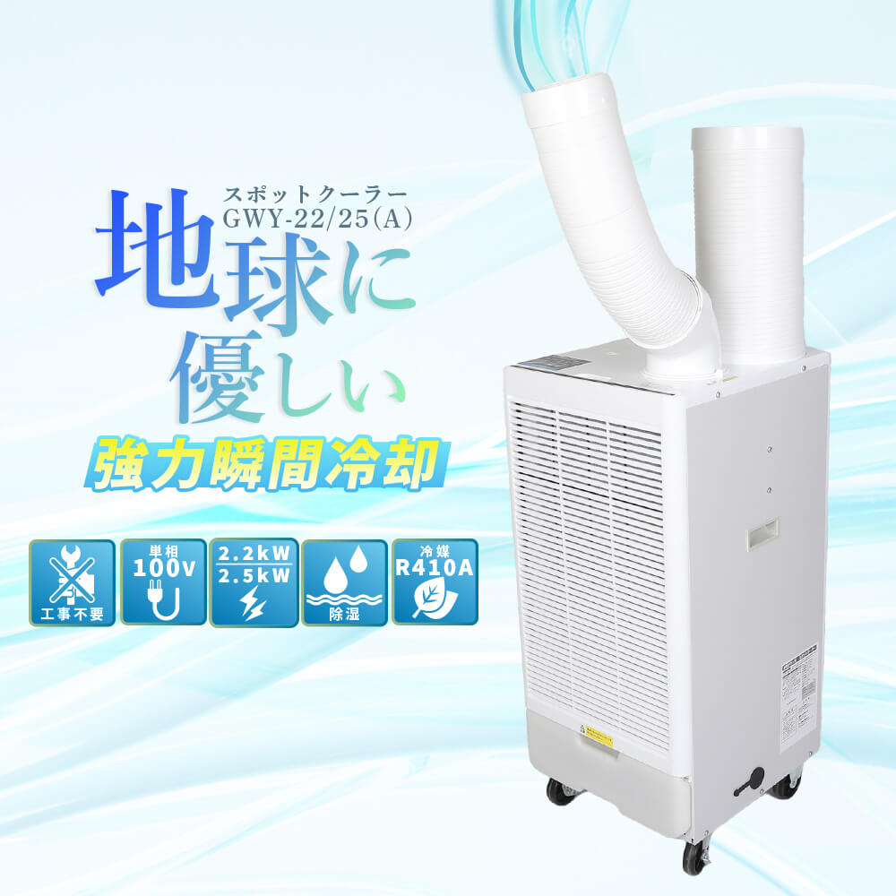 | 沖縄・離島のお客様からのご注文の場合は、別途離島中継料が発生します。 注文確定後、追って弊社カスタマーより佐川急便様に確認した金額をメールにてご案内させていただきます。 予めご了承ください。 【局所冷房に最適】 スポットクーラーはダクトからピンポイントに冷風を送ることができるので、局所冷房に適しています。 作業場や工場などでは部屋全体を冷やすよりも電気代の節約につながります。 また、エアコン設置工事が出来ないところでも、AC100Vのコンセントがあれば簡単に設置できます。 【省ドレン設計】 ドレン水が発生するのを抑えた省ドレン設計になっているので、ドレンタンク(5L)に水がたまりにくいのが特長です。 なお、ドレンホースで排水すれば、タンクが満水になるの水を気にすることなく使うことができます。 【冷風&送風モード】 強弱の切換が可能な冷風&送風モード搭載。冷房能力は「強」で約2.2/2.5kW(50/60Hz)と、業務用としては十分なスペックを有しています。 【伸縮可能な蛇腹式排熱ダクト付属】 伸縮し長さ調節が可能な排熱ダクトが付属されています。 排熱ダクトは蛇腹式で約34〜127cmに伸縮します。 【キャスター付きで据付工事不要】 移動に便利なキャスター付き。 キャスターにはロックが付いているので、その場に固定することが可能です。 据付工事も不要なので、設置したい場所に移動させてすぐに使えます。 【ご購入前にご確認ください】 ※沖縄・離島、その他一部地域からのご注文はお受けできません。システムの都合上ご注文は可能ですが、自動キャンセルになりますのでご了承ください。 ※当店ではのし・ラッピング梱包は承っておりません。 ※お客様都合でのキャンセル及び返品・交換は受け付けておりません。あらかじめご了承の上、ご注文ください。【局所冷房に最適】 スポットクーラーはダクトからピンポイントに冷風を送ることができるので、局所冷房に適しています。 作業場や工場などでは部屋全体を冷やすよりも電気代の節約につながります。 また、エアコン設置工事が出来ないところでも、AC100Vのコンセントがあれば簡単に設置できます。 【高い冷房能力】 冷房能力は「強」で2.2/2.5kW(50/60Hz)と、業務用としては十分なスペックを有しています。 また、最近ではご家庭でご使用される方も増えてきています。 【移動しやすい】 φ50mmのキャスター付きなので、移動も比較的簡単です。 キャスターは4個中2個にロック機構があり、設置位置の固定も可能。 また、本体重量も比較的軽い設計となっています。 【省ドレン設計】 ドレン水が発生するのを抑えた省ドレン設計になっているので、ドレンタンクに水がたまりにくいのが特長です。 室温35度、湿度60%の環境下で約8時間連続運転が可能です。 なお、ドレンホースで排水すれば、タンクの水を気にすることなく使うことができます。 【排熱ダクト延長可】 排熱ダクトを延長したいときには、別売のアルミフレキダクト(φ150mm)が接続可能です。 締め切った空間で室内の温度を上昇させたくない方におすすめです。 アルミフレキダクトはホームセンター等で購入できます。 ●容量5Lのコンパクトなドレンタンクで、排水処理が簡単。 ●市販のダクト(φ150が簡単に接続可能な排熱ダクト付き)。 ●作業場、待機場所などの冷房に、工場などの温度管理に、整備工場の空調や庫内の冷房に。 ●高温環境下でも安定動作ができる、オーバーヒートしにくい内部構造。 ●冷房/送風切替。 ●環境に優しいR410a冷媒採用。 ●連続運転約8時間。 ●210度回転冷風ダクト。 ●エアフィルター装備。 ●φ50キャスター(2ヶ所ロック機能付き)。 ●一口フロアタイプ。 | |
