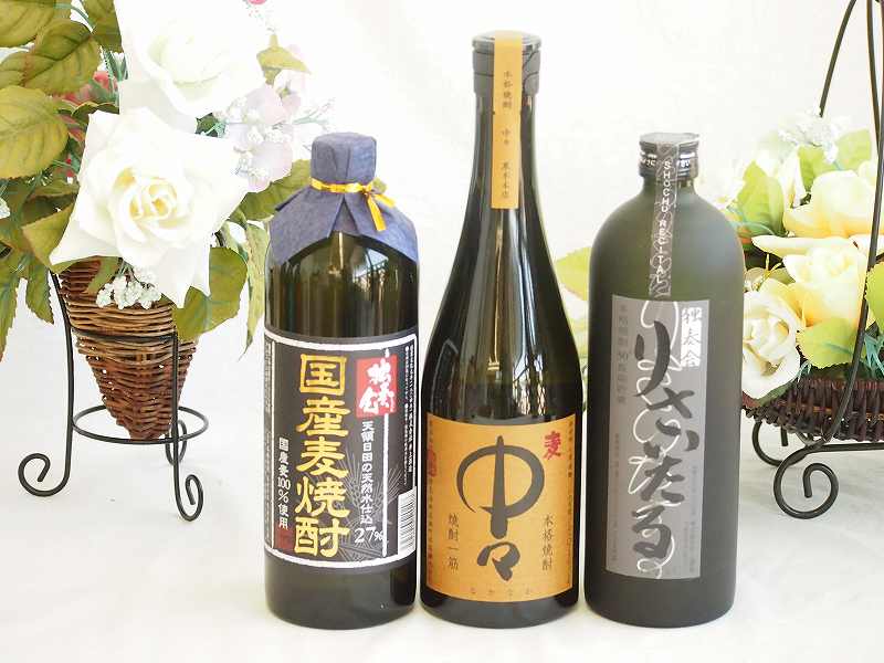 | ※一部地域へのお届けは別途送料かかります。 ●本格麦焼酎 佐藤 麦 霧島連山の麓に位置する佐藤酒造が精魂込めて作り上げた麦焼酎です。素材の良さをとことんまで活かし、麦の香りと味を素直に引き出すことに成功しています。麦の素材と素直な甘さをお楽しみ下さい。 アルコール度:25度 容量:720ml 使用原料:麦、麦麹(白) 蔵元:佐藤酒蔵(鹿児島県) ●大麦焼酎 中々(なかなか) 手造りの麹と徹底的に選りすぐった大麦のみを使っています。麦の柔らかい味わいがよく表現され、甘さ香る呑みやすさが特徴です。一口呑めば「おっなかなかだねぇ〜!」とつぶやきたくなること間違いなし。 アルコール度:25度 容量:720ml 使用原料:大麦・麦麹 蔵元:黒木本店(宮崎県) ●麦焼酎 一粒の麦(ひとつぶのむぎ) テンポのよい香りと濃厚でくせのない円熟した味わいが特徴です。間接常圧蒸留と言う特別な蒸留方法を用いており、麦本来の力を十二分に引き出した焼酎となっております。ロックや水割りで人気のある一本です。 アルコール度:25度 容量:720ml 使用原料:大麦・大麦麹 蔵元:西酒造(鹿児島県) | |