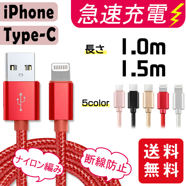 充電ケーブル ライトニング iPhone lightning Type-C 長さ1m 1.5m充電器 断線防止 急速充電 アイフォン 5color ナイロン編み スマホ ¥288 |