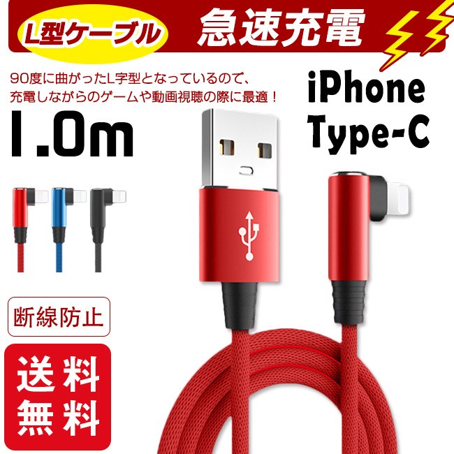 充電ケーブル ライトニング L字型デザイン iPhone lightning Type-C 長さ 1m 充電器 断線防止 急速充電 アイフォン 3color スマホ ¥360 |